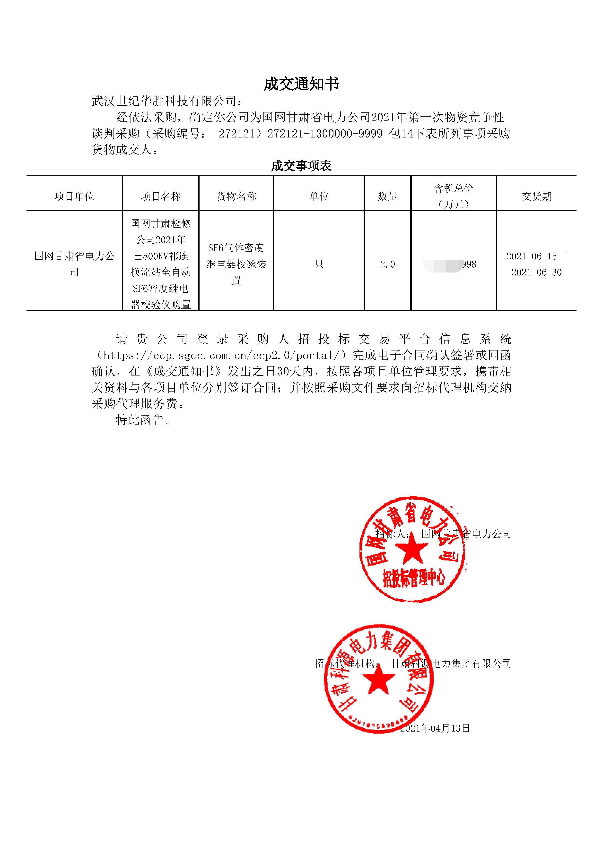 热烈祝贺金彩汇在国网甘肃省电力公司2021年第一-次物资竞争性 谈判采购项目中中标