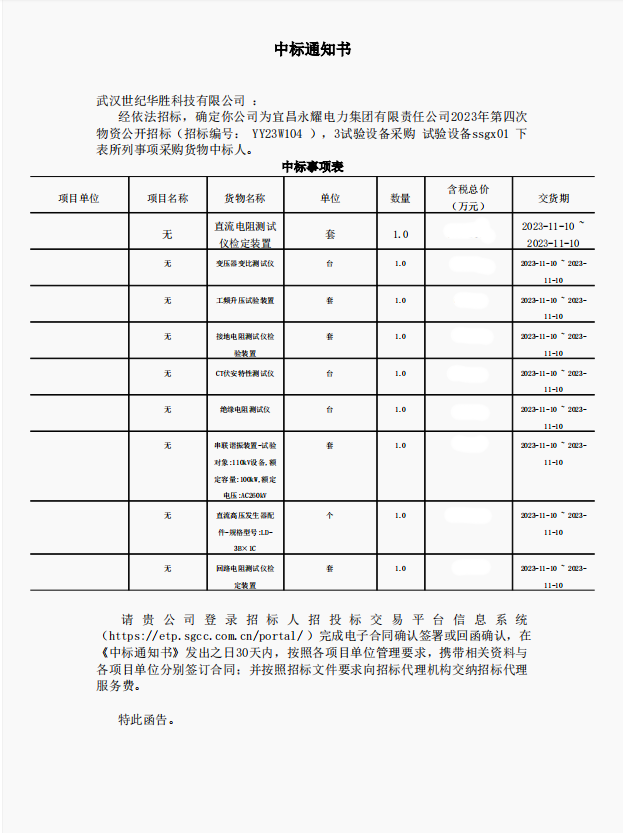 热烈庆祝金彩汇在宜昌永耀电力集团有限责任公司2023年第四次物资公开招标项目中标