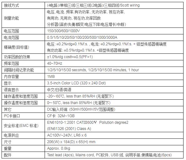 ☆ 测定及演算:电压(RMS)、电流(RMS)、有功/无功/视在功率、功率、相位角、中性线电流、有功/无功/视在电能的测定和演算。真有效值显示。